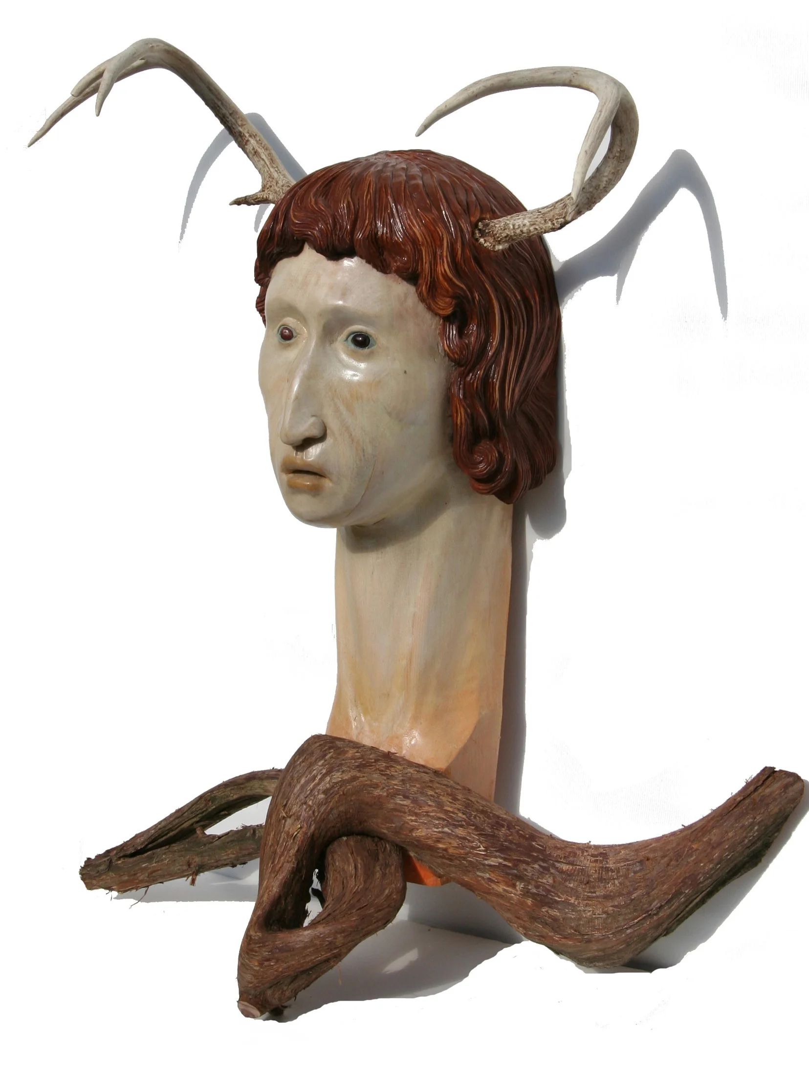 Basswood, paint, deer horns. 52” x 35” x 10”